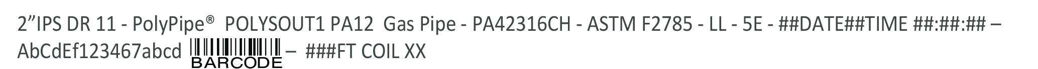 BARCODE printline per ASTM F2897 for DIMP compliance and in accordance with 49 CFR Part 192 (Amdt. 192-124)